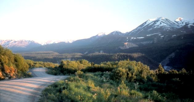 Hwy at around Mile 1015 south through the extreme northwest corner of British
